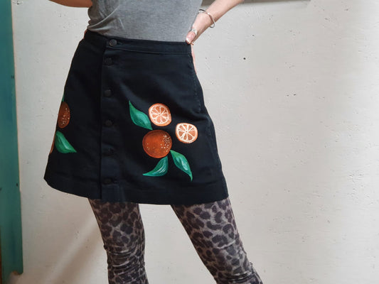 'Tangerine' Hand painted up-cycled black denim mini skirt