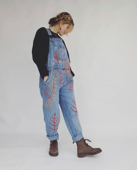 'Autumn Ferns' Hand painted, up-cycled, denim dungarees