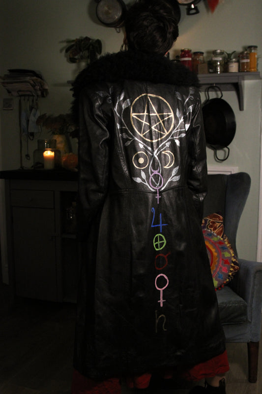 'Pagan planets witches' Vintage leather black coat, Faux sheepskin Collar